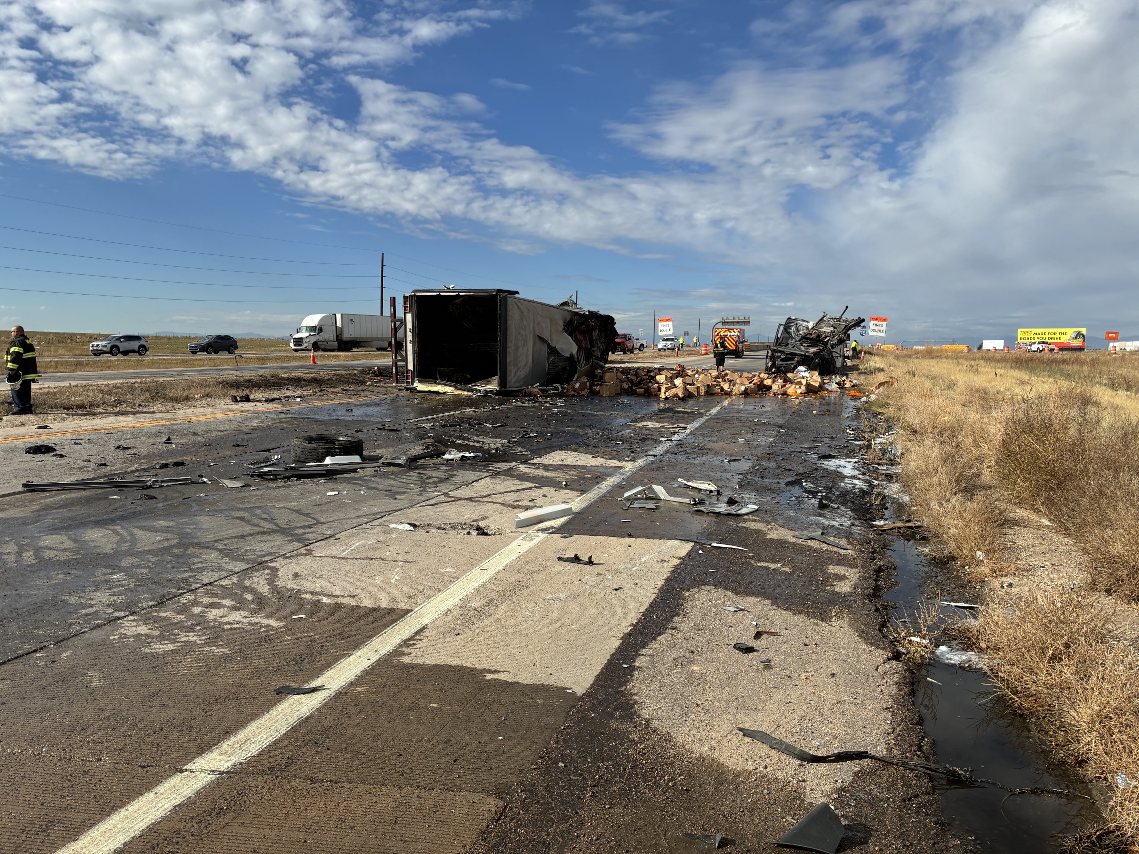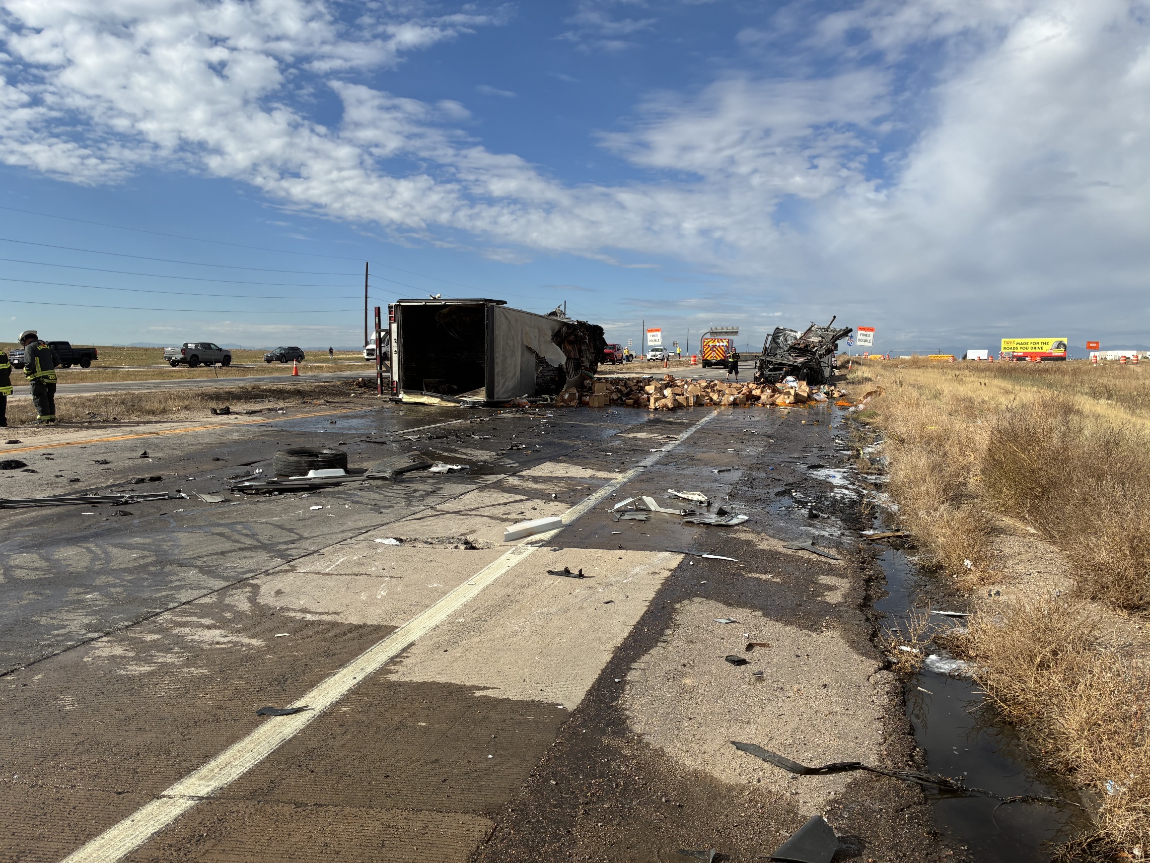 Description: Two semi-trucks crashed on I-70 near E-470 in Adams County, Colorado, causing one to erupt in flames and shutting down the interstate. Eastbound lanes and one westbound lane have reopened as crews continue cleanup.