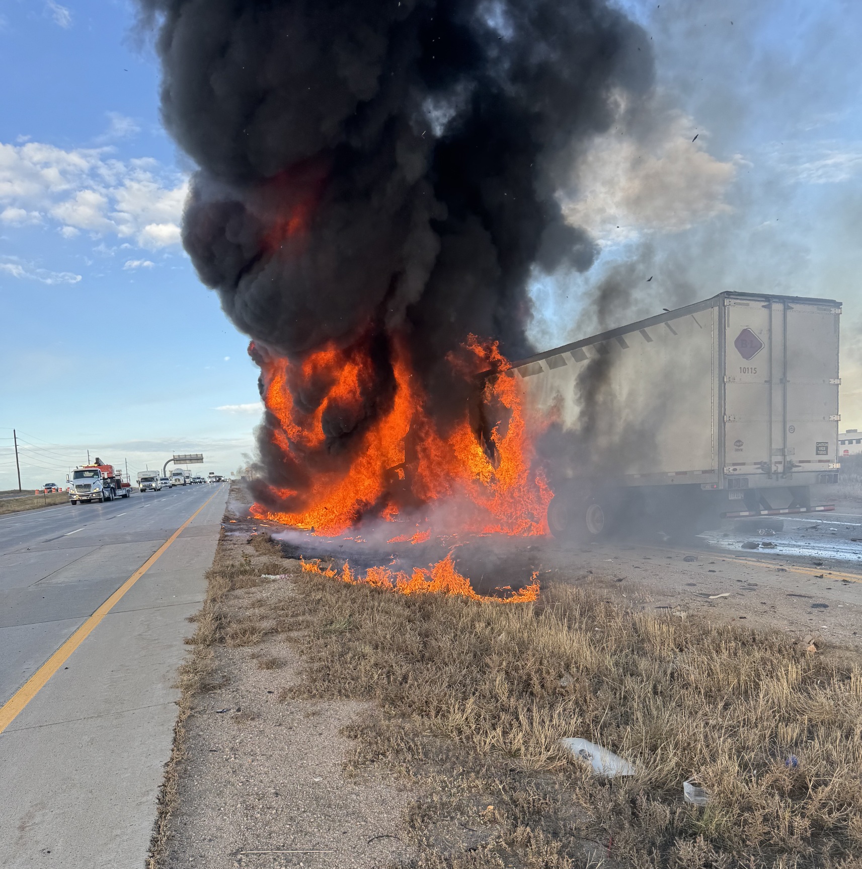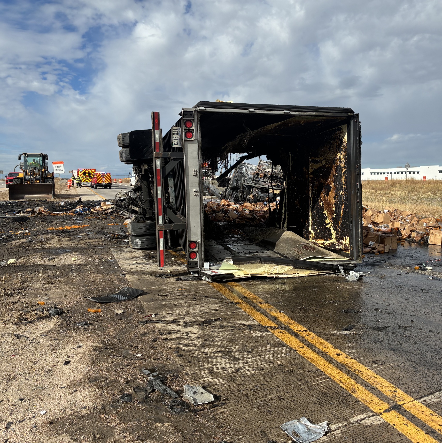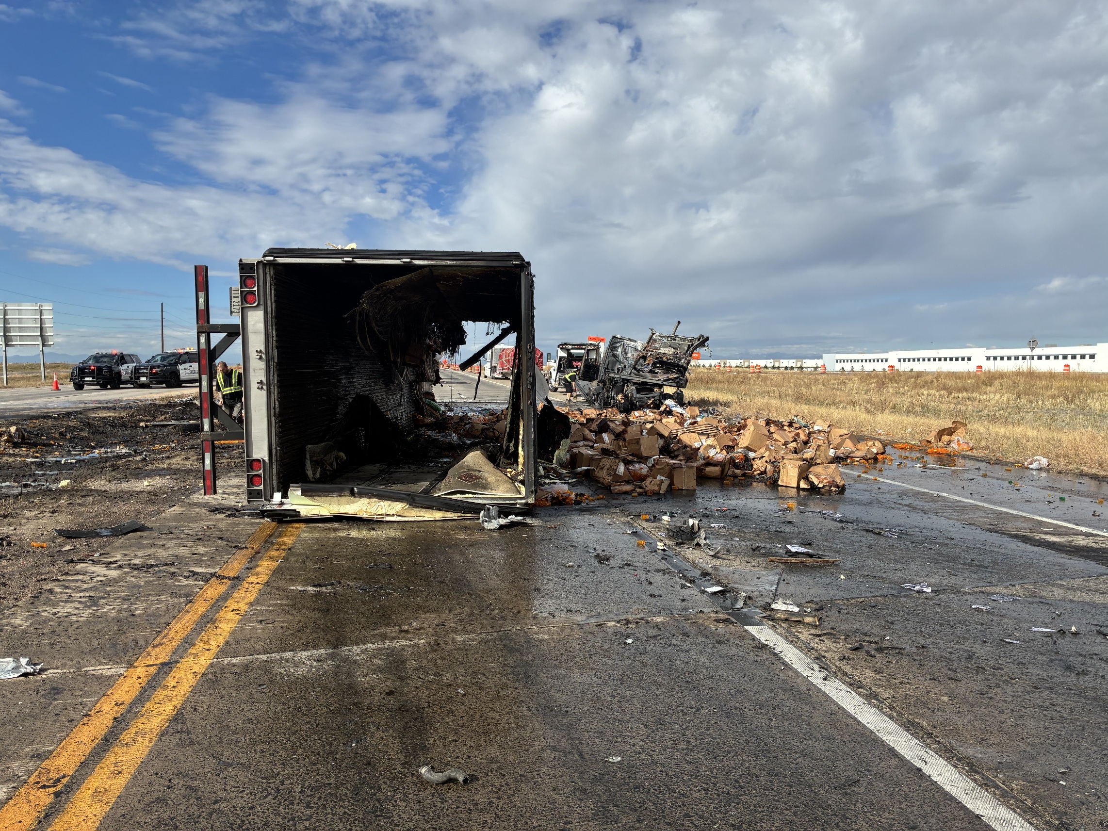 (Adams County, Colorado) - Earlier this morning at approximately 8:26 a.m., the Colorado State Patrol responded to a crash involving two semi trucks on Interstate 70 near milepost 289, west of E-470. One of the tractor-trailers became fully engulfed in flames, shutting down traffic in both directions of I-70. All eastbound lanes and one westbound lane have been reopened.