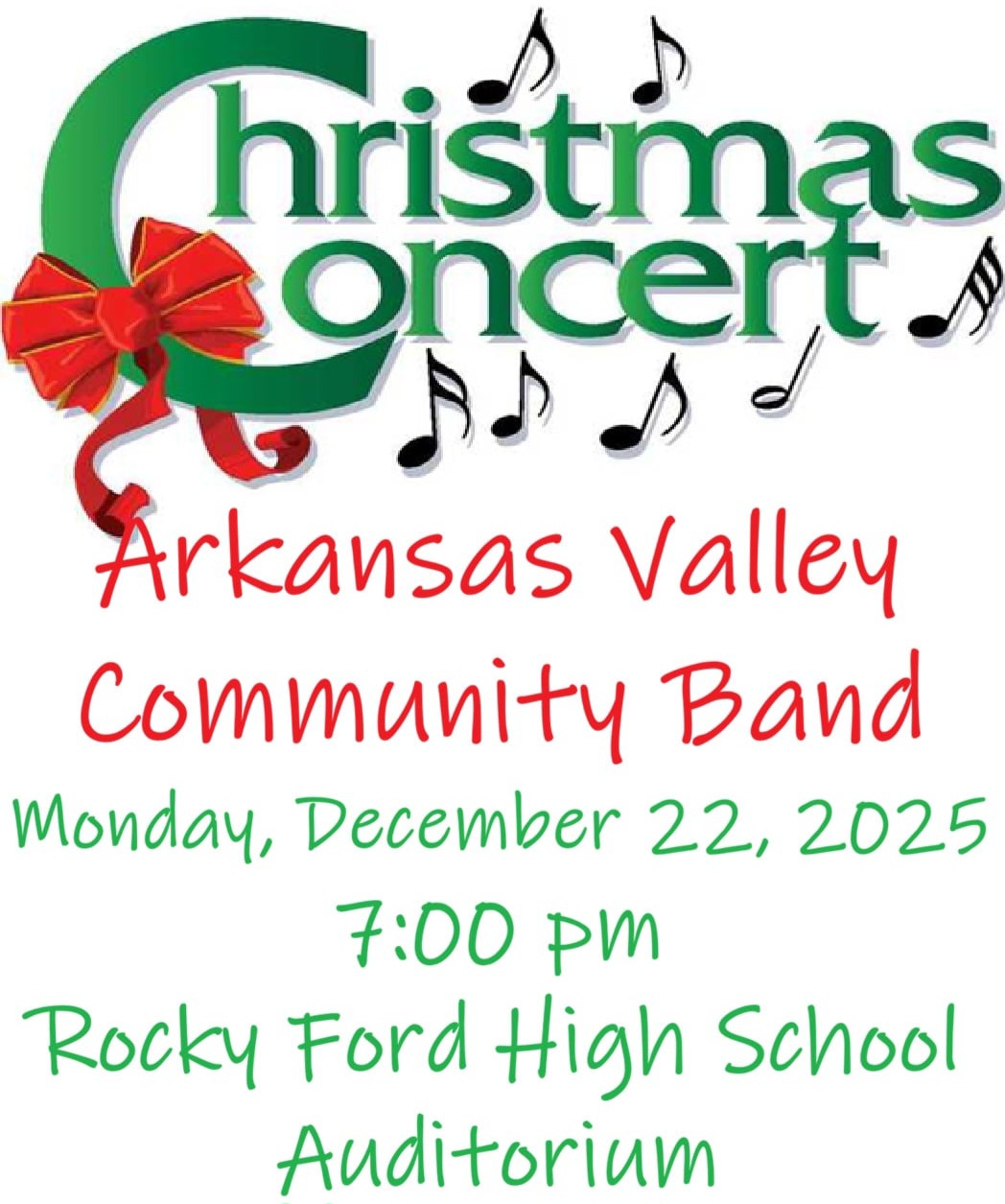Enjoy a festive evening of music and community spirit as the Arkansas Valley Community Band presents a FREE Christmas Concert on Monday, December 22, 2025, at 7:00 PM at the Rocky Ford High School Auditorium.