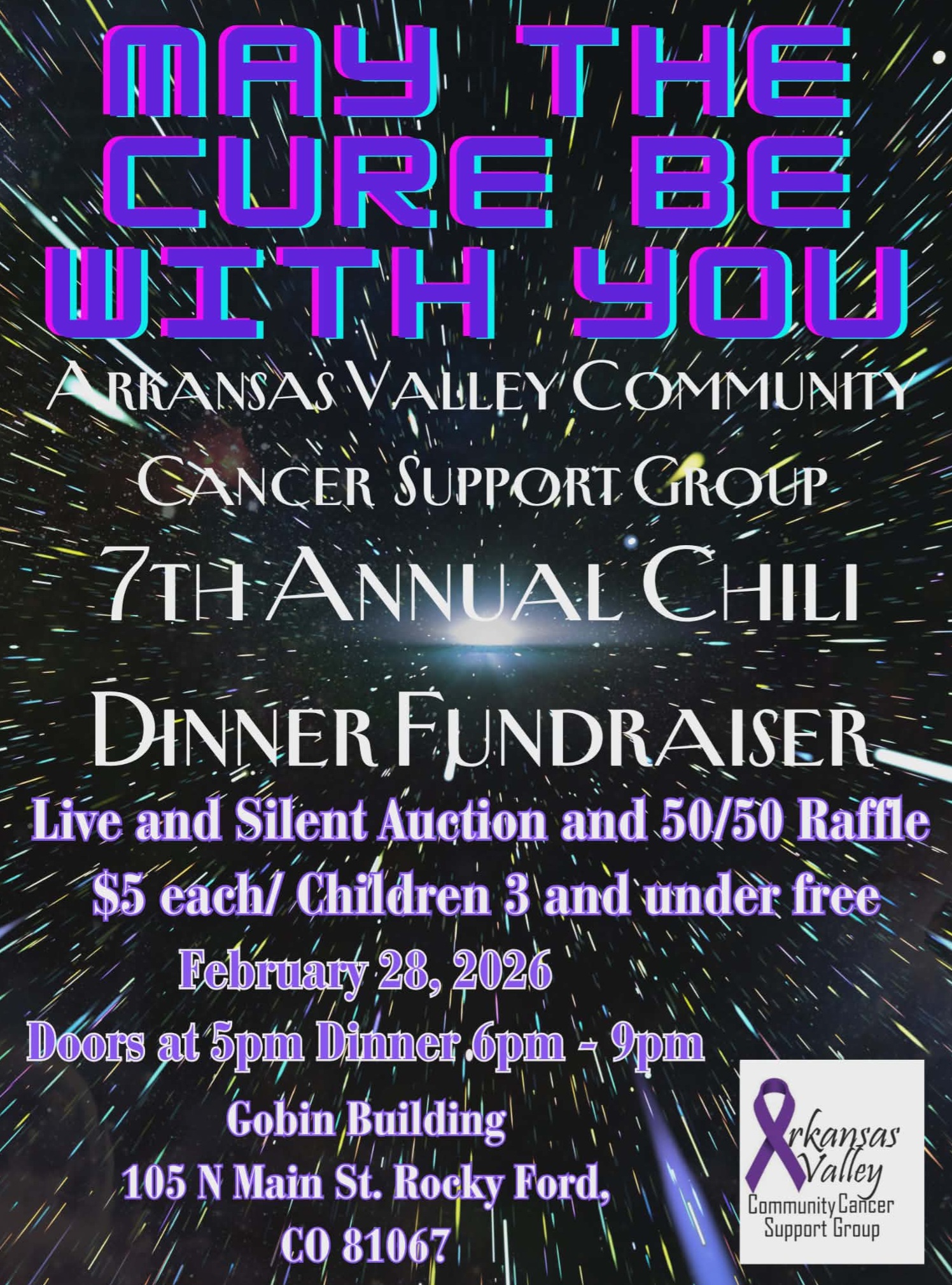 Description: Join the Arkansas Valley Community Cancer Support Group on Feb. 28, 2026, for the 7th Annual Chili Dinner Fundraiser at the Gobin Building in Rocky Ford, featuring auctions, raffles, and community support.