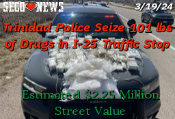 101 POUNDS OF DRUGS SEIZED DURING TRAFFIC STOP "On March 19, 2024, Trinidad Police Department officers conducted a traffic stop on a vehicle traveling through Trinidad on Interstate 25. During the traffic stop, K9 Jefe was deployed to conduct a fr...