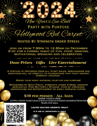 New Year's Eve Ball - PARTY WITH PURPOSE - Hollywood Red Carpet HOSTED BY STRENGTH UNDER STRESS JOIN US FROM 7:30PM TO 12:30AM ON DECEMBER 31ST FOR A FORMAL NIGHT OF FUN, FOOD, DANCING, MOTIVATIONAL SPEAKING AND CELEBRATION. Door Prizes - Gifts - ...