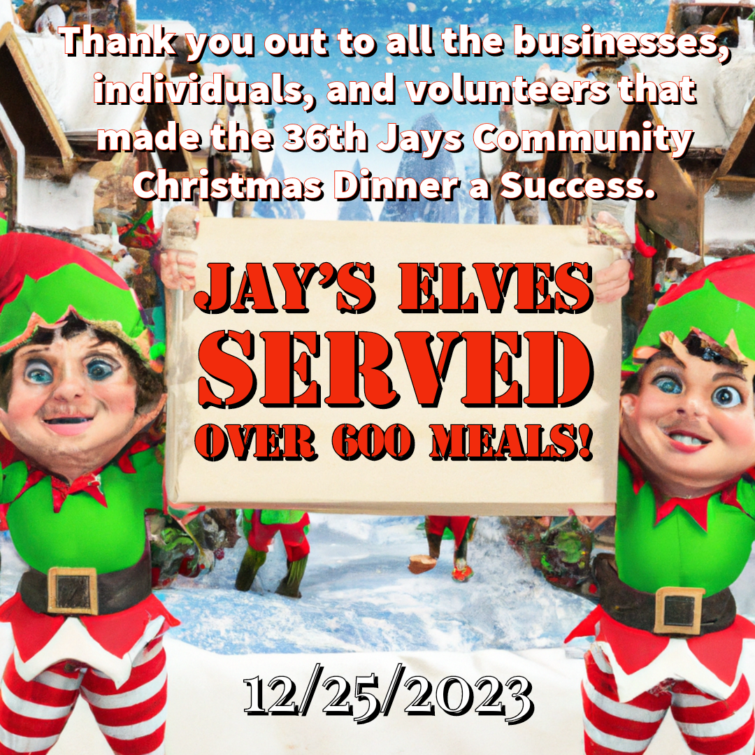 Thank You from Jay's Elves - Over 600 Meals Served at 36th Annual Jay’s Community Christmas Dinner Jay's Community Christmas Dinner Elves would like to Thank everyone that helped make our 36th annual dinner a big success. We served over 600 ...