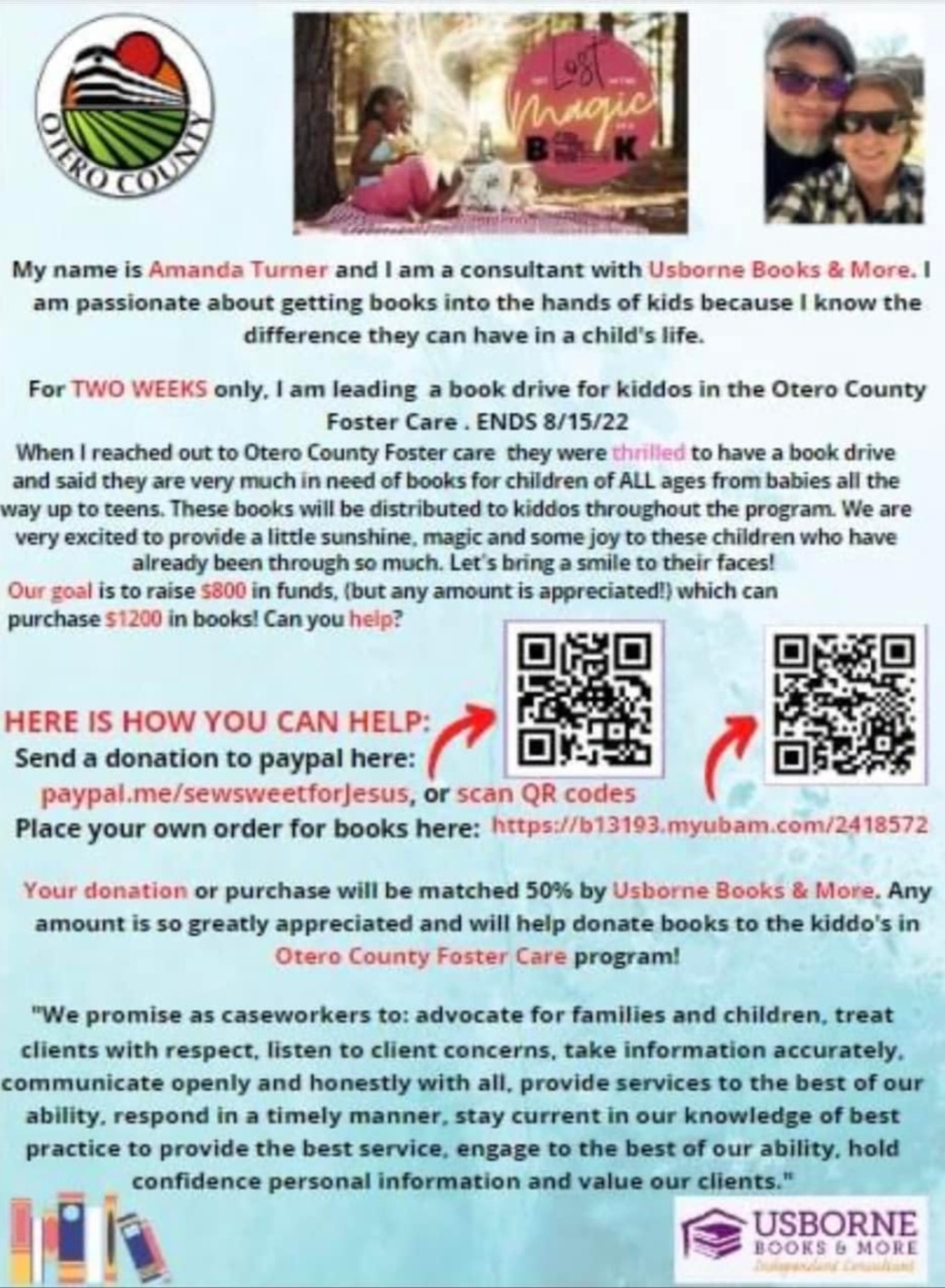 Otero County Foster Care Book Drive Ends Aug 15, 2022 My name is Amanda Turner and I am a consultant with Usborne Books & More. I am passionate about getting books into the hands of kids because I know the difference they can have in a child's...