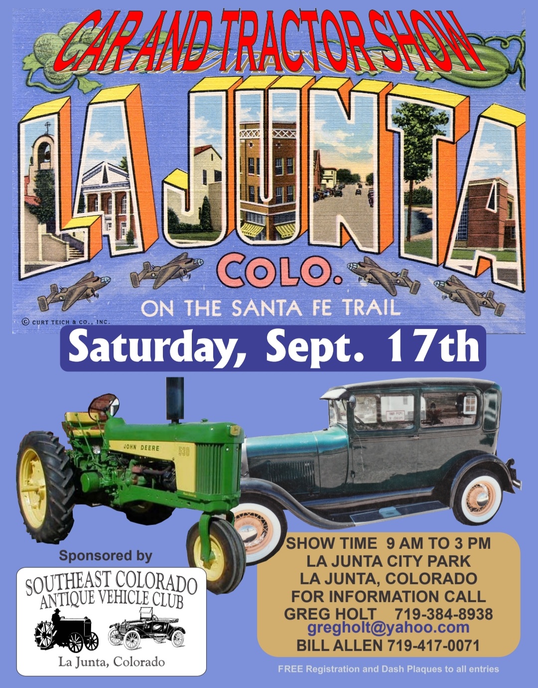 CAR AND TRACTOR SHOW In La Junta, Colorado on the Historic Santa Fe Trail Saturday, Sept. 17th, 2022 Sponsored by: SOUTHEAST COLORADO ANTIQUE VEHICLE CLUB SHOW TIME 9 AM TO 3 PM LA JUNTA CITY PARK FOR INFORMATION CALL GREG HOLT 719-384-8938 gregho...