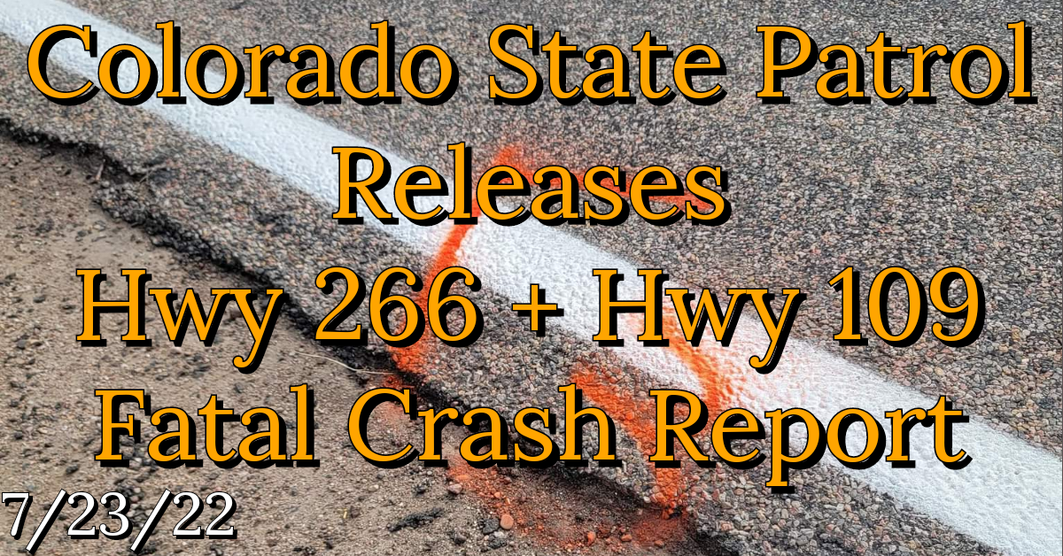 CSP Reports on Hwy 266 & Hwy 109 Accident 7/23/22 On July 23, 2022 The Colorado State Patrol responded to a two vehicle accident at 8:23 am at the intersection of Hwy 266 and Hwy 109. Vehicle 1: Grey 2016 Subaru Impreza from Vermont, driven by...