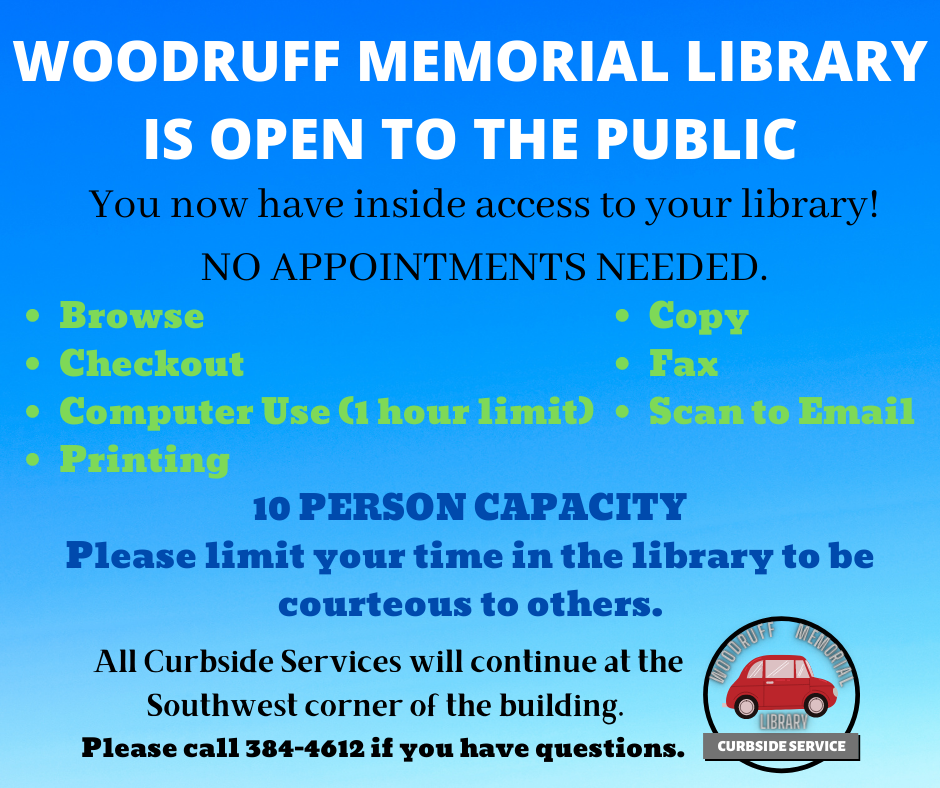 Woodruff Memorial Library is keeping busy serving the Arkansas Valley community. Otero County is now in Level Blue on the COVID-19 restrictions dial, so the Library was able to open its doors 2/8/21 with limited capacity! Please be aware of the fo...
