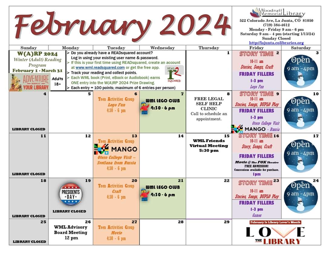 February is LOVE YOUR LIBRARY month!! We are thankful for another full month of programs, services and resources! Being open on Saturdays has been a beautiful blessing for our community and people traveling through La Junta. Please make sure you t...