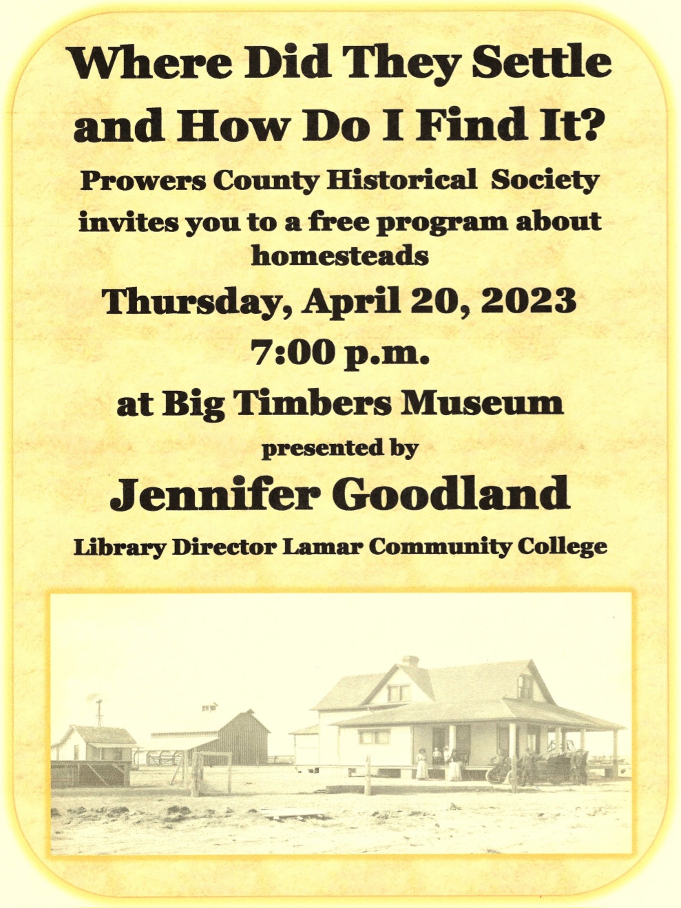 Big Timbers Museum Day July 1, 2023 5:00 p.m. – 7:00 p.m. 7515 U.S. Hwy 50, Lamar, CO Burgers, Hot Dogs, Baked Beans, Chips, Lemonade, Water, & Dessert at 5:00 p.m. Live Concert at 6:00 p.m. Silent Auction Admission to visit the museum i...