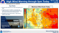 Today Patchy blowing dust after noon. Sunny, with a high near 76. Very windy, with a west southwest wind 10 to 20 mph increasing to 30 to 40 mph. Winds could gust as high as 55 mph. Tonight A chance of rain and snow showers before 1am, then a chan...