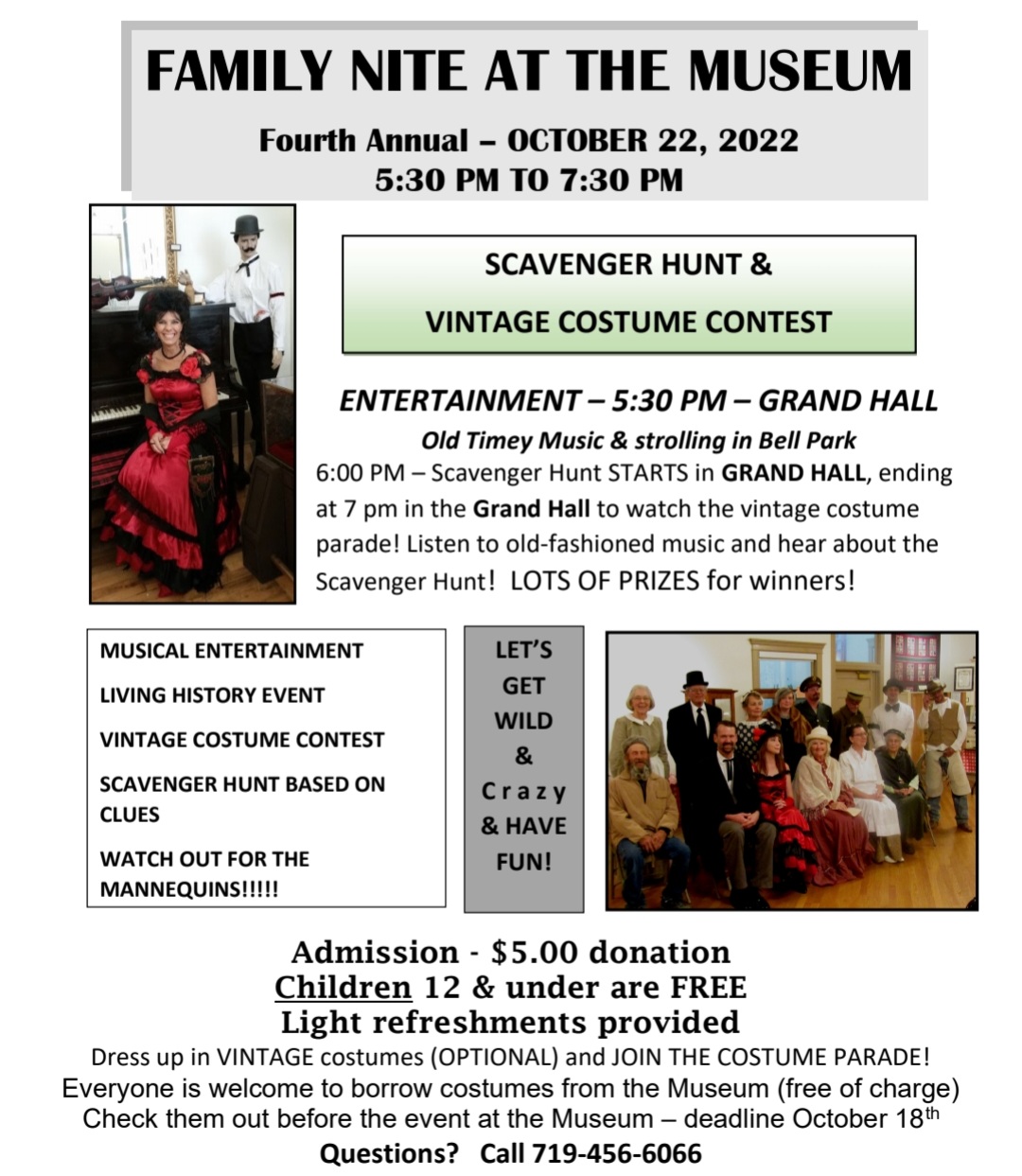 Family Night at The Museum Oct 22 in Las Animas The Rawlings Heritage Center is proud to announce the fourth annual, “Family Nite at the Museum,” on October 22nd from 5:30 pm to 7:30 pm. Light refreshments will be provided. We are havi...