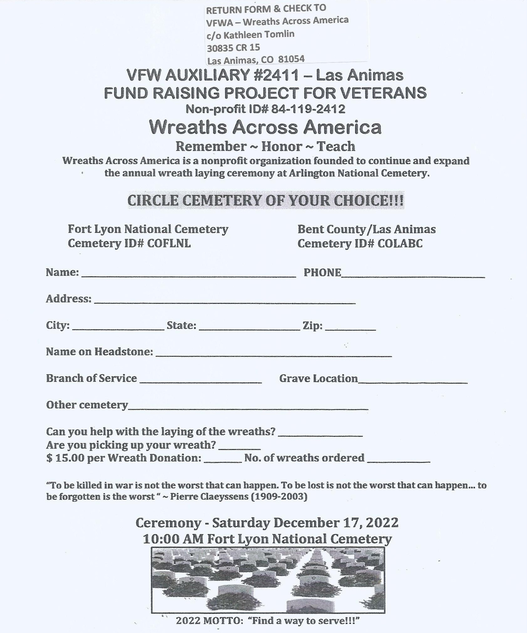 14th Annual Wreath’s Across America Project Kicks Off with Las Animas VFW Aux. #2411 WREATHS ON SALE NOW Las Animas VFW Auxiliary #2411 has kicked off their 14th annual Wreath’s Across America project. We REMEMBER, HONOR, AND TEACH. Th...