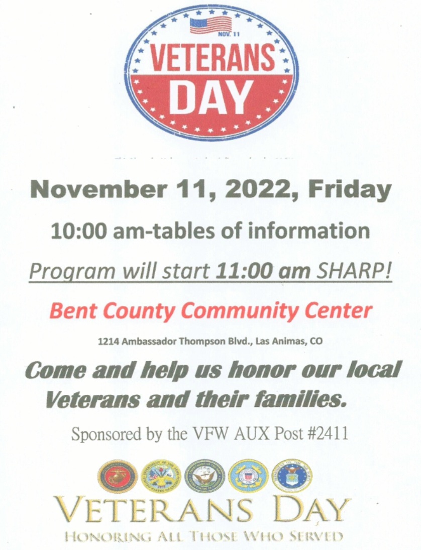VETERANS DAY ANNOUNCEMENT: The Las Animas VFW Auxiliary #2411 is proud to announce Veterans Day activities for November 11th. We will hang the Avenue of Flags in Las Animas and McClave/Hasty at 7:00 am and take down at 4pm. All volunteers will be ...