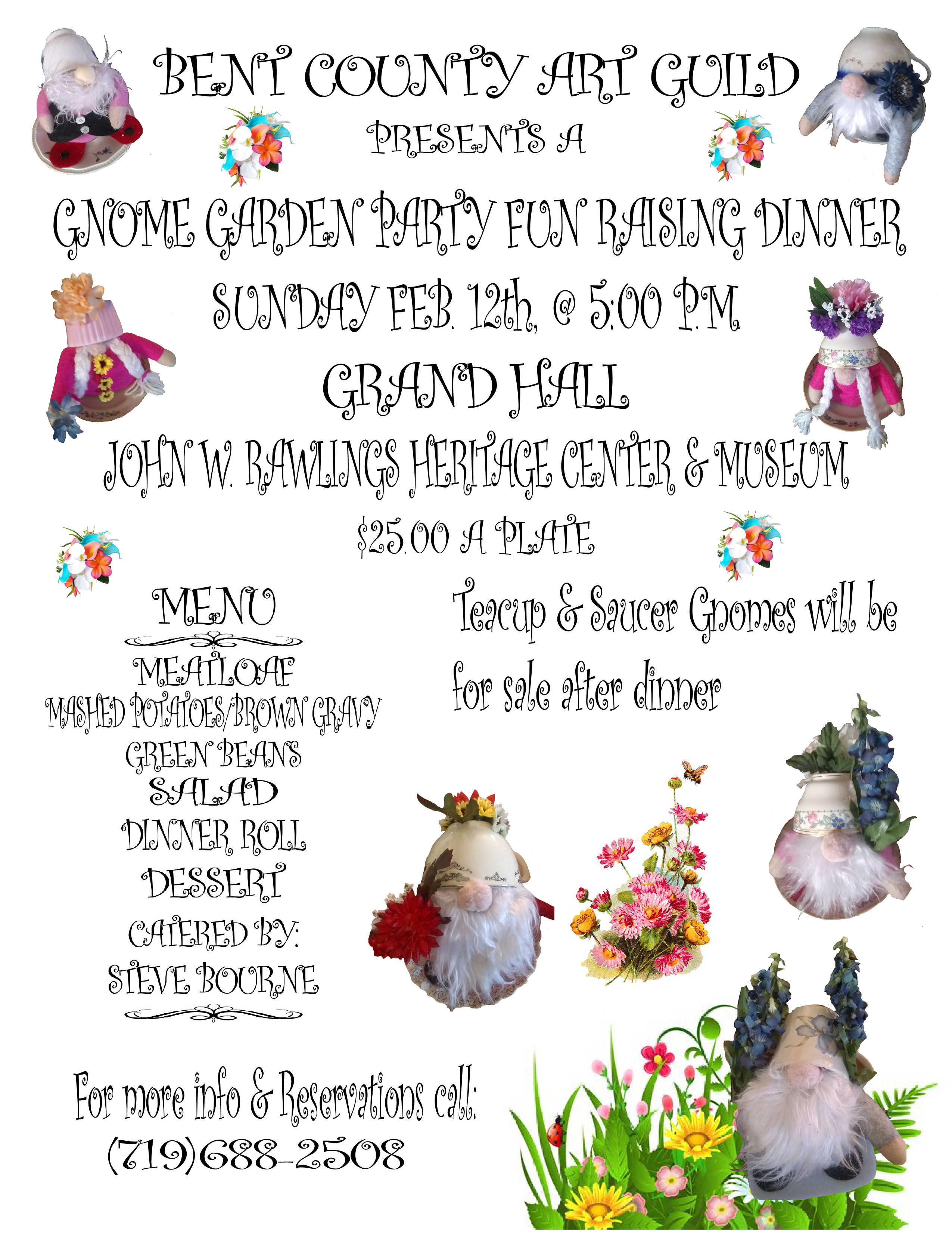 By Linda Bourne Bent County Art Guild Annual Fun Raiser The community is invited to a Gnome Garden Party Fun Raising Dinner on Sunday February 12th at 5pm at the John Rawlings Heritage Center Grand Hall. The dinner is $25.00 a plate and includes a...