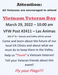 CELEBRATION OF FLAG DAY By Kathleen Tomlin June 19, 2022 VFW Day of Service was celebrated this past week with Flag Day activities. The Las Animas, McClave, and Hasty Avenue of Flags flew proudly on Flag Day, which was Tuesday, June 14th. We thank...