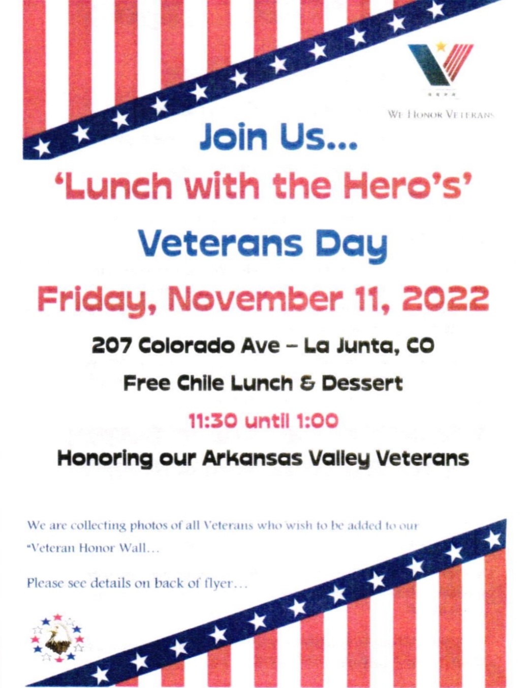 We Honor Veterans Program through the Sangre de Cristo Hospice Volunteers will have "The Wall of Heroes" on display at the downtown office, 207 Colorado Ave. Viewing is open to the public daily, starting November 7th from 10:00 am to 2:00 pm and e...