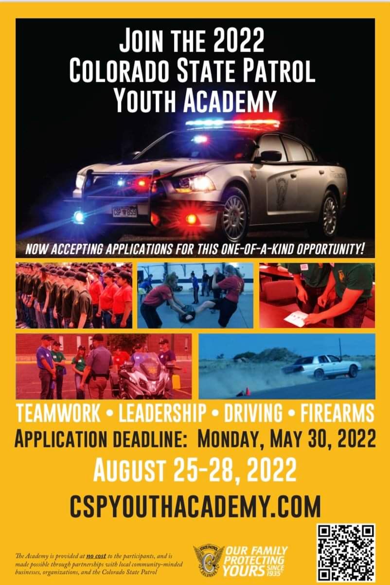 Colorado State Patrol Youth Academy Application Period Open Are are a high school student with a driver’s license? Would you like to gain valuable leadership skills for the future? Would you like to have a week of amazing fun…for free...