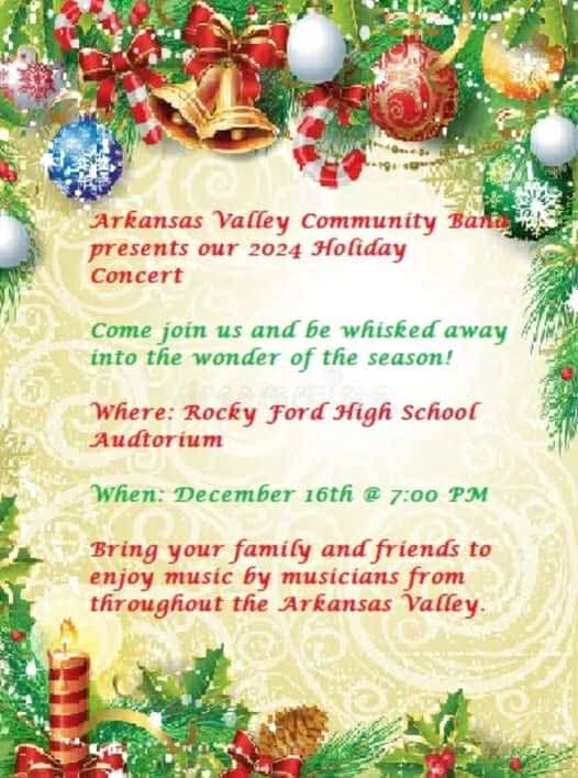 The Arkansas Valley Community Band Christmas Concert Monday, Dec 16th The Arkansas Valley Community Band will play a Christmas concert in the Rocky Ford High School theatre Monday, Dec. 16, at 7 p.m. This is a free concert, and the public is invit...