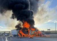 Two Semi Crash, One Erupts into Flames I-70 is closed in both directions (Adams County, Colorado) - Earlier this morning at approximately 8:26 a.m., the Colorado State Patrol responded to a crash involving two semi trucks on Interstate 70 near mil...