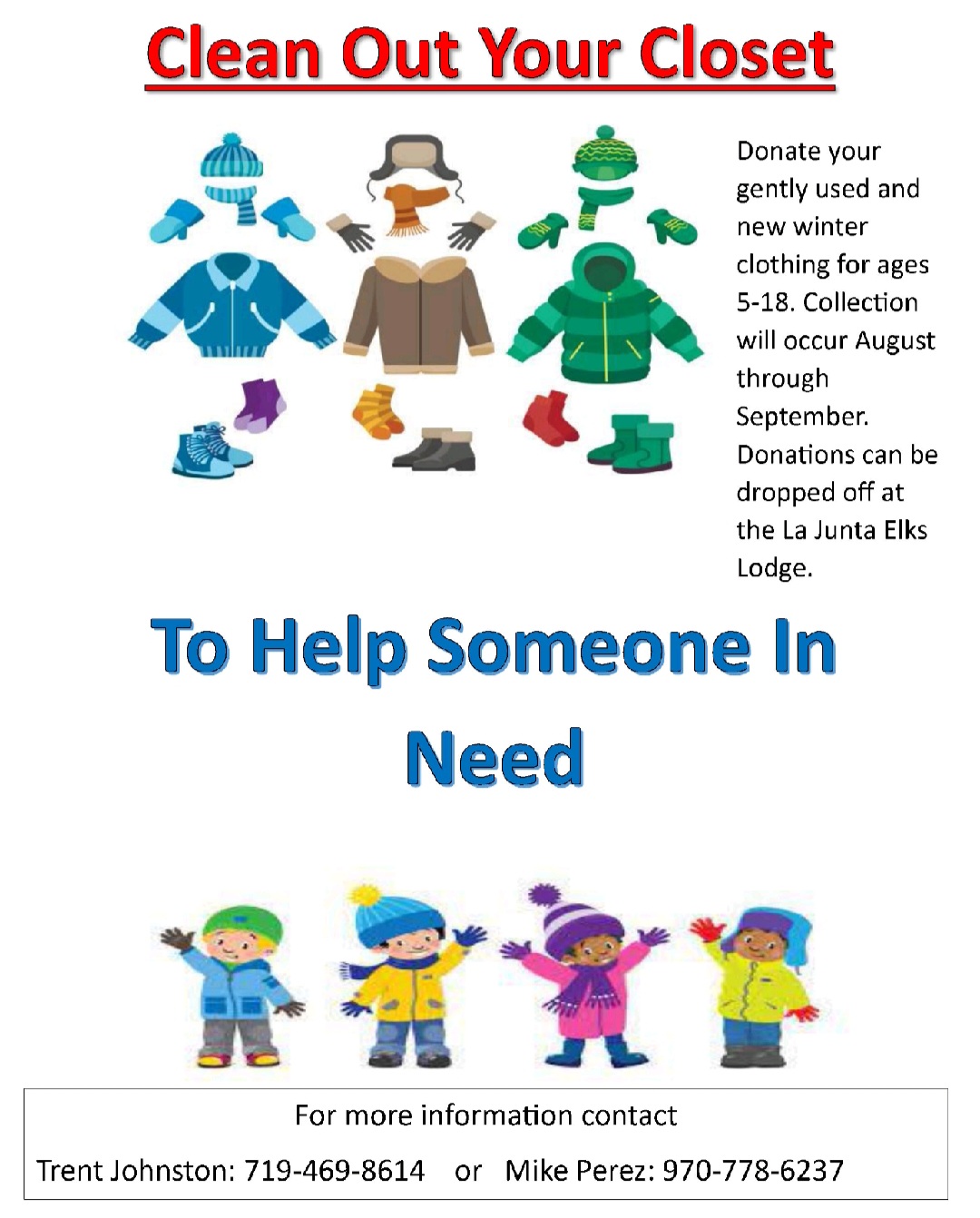 Clean Out Your Closet! La Junta Elks Donation Drive A community service project organized by Trent Johnston in colaboration with the La Junta Elks Lodge. The La Junta Elks Lodge is collecting new or gently used winter clothing for ages 5-18 from A...