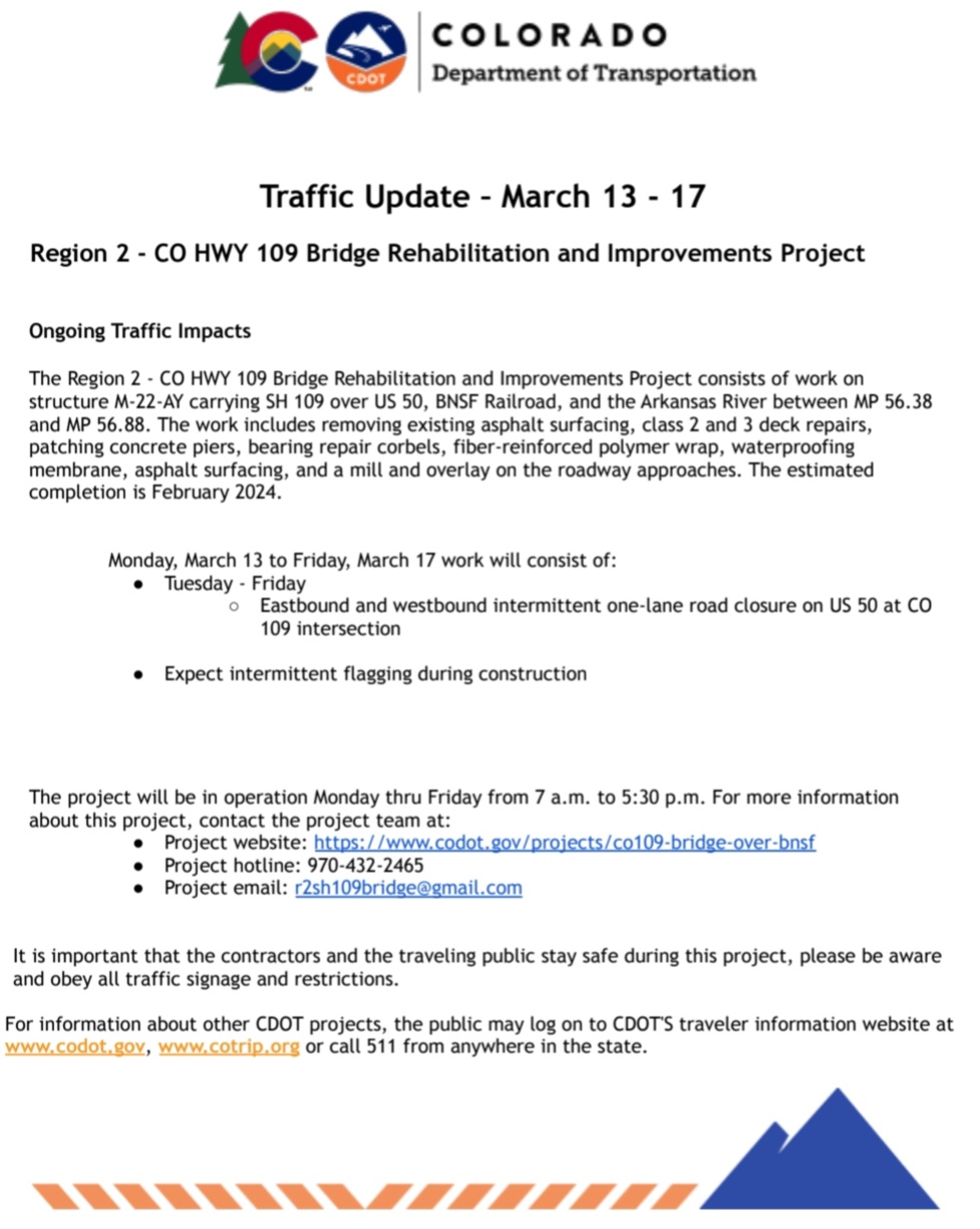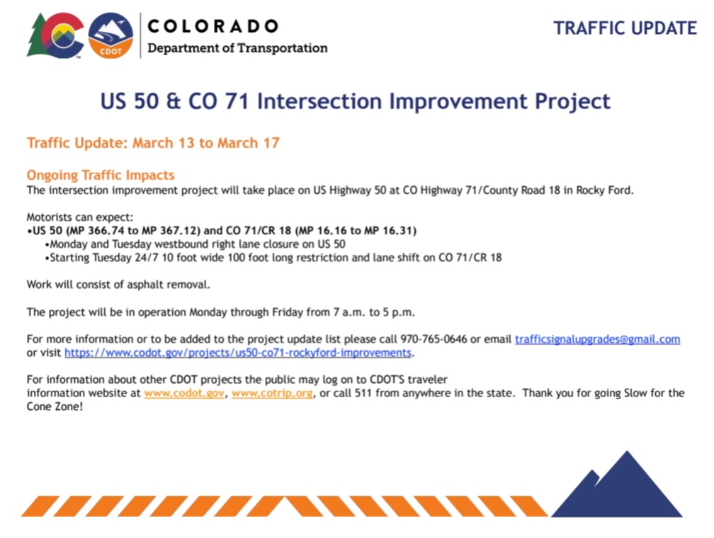 US 50 & CO 71 Intersection Improvement Project Traffic Update: March 20 to March 26 Ongoing Traffic Impacts The intersection improvement project will take place on US Highway 50 at CO Highway 71/County Road 18 in Rocky Ford. Motorists can expe...