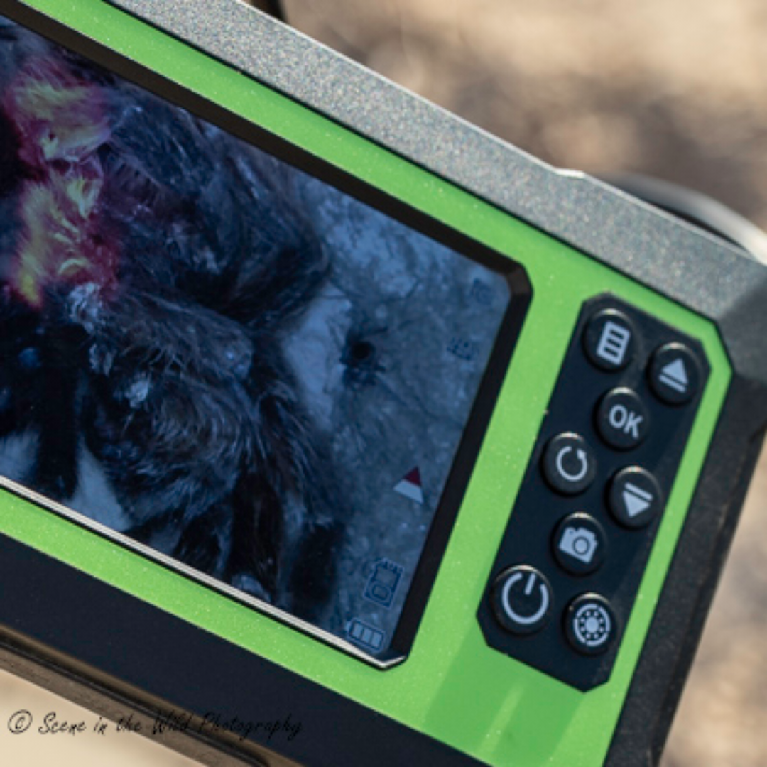 The evening we met Allendorfer out on the site, he was very happy, because the night before was the first time he’d been able to see the tarantula spiderlings. He’d already discovered that mother tarantulas are, like most moms, very protective of their egg sacs. The camera would hardly reach the egg sac in the burrows when the mothers would appear and grab ahold of the sac. As we watched on the camera’s screen, we were able to see some spiderlings; then the mother jumped up: “That’s a mom right there, taking care of her spiderlings,” Allendorfer excitedly pointed out. He said that he’d seen the moms pull the egg sac farther into the burrow when the camera is inserted.