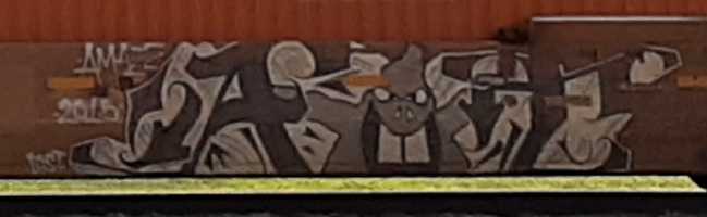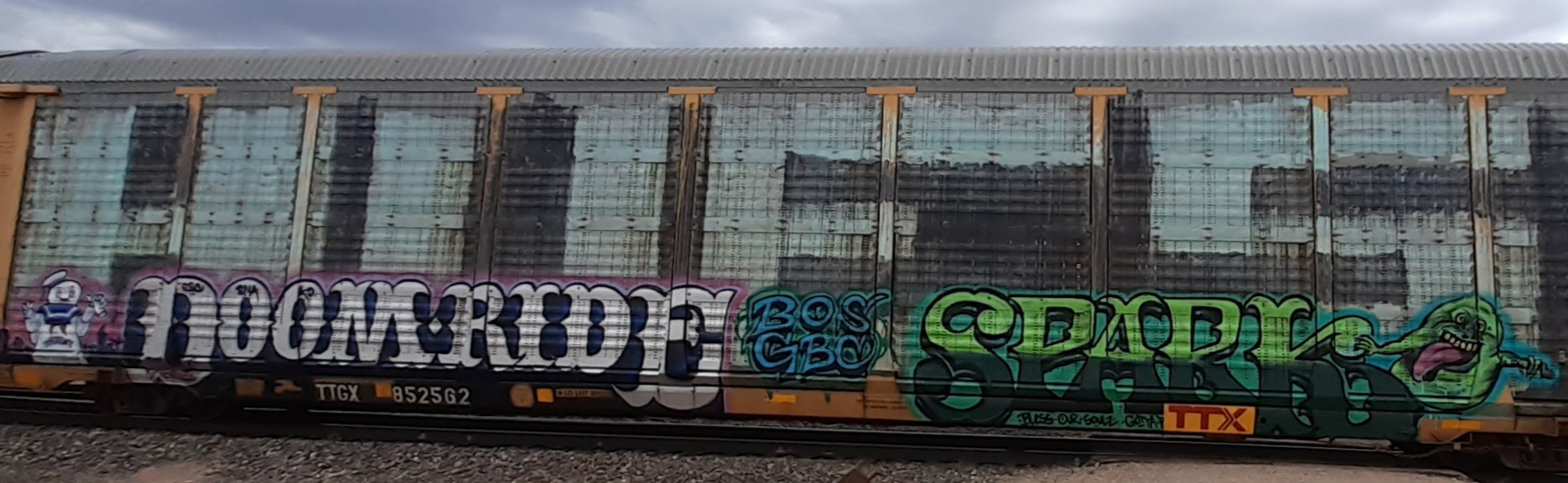 Description: Layers of graffiti cover this train car. You never know who will make an appearance from pop culture. Did the artist bring their own scaffolding, or maybe even their friends to carry a generator and lights?