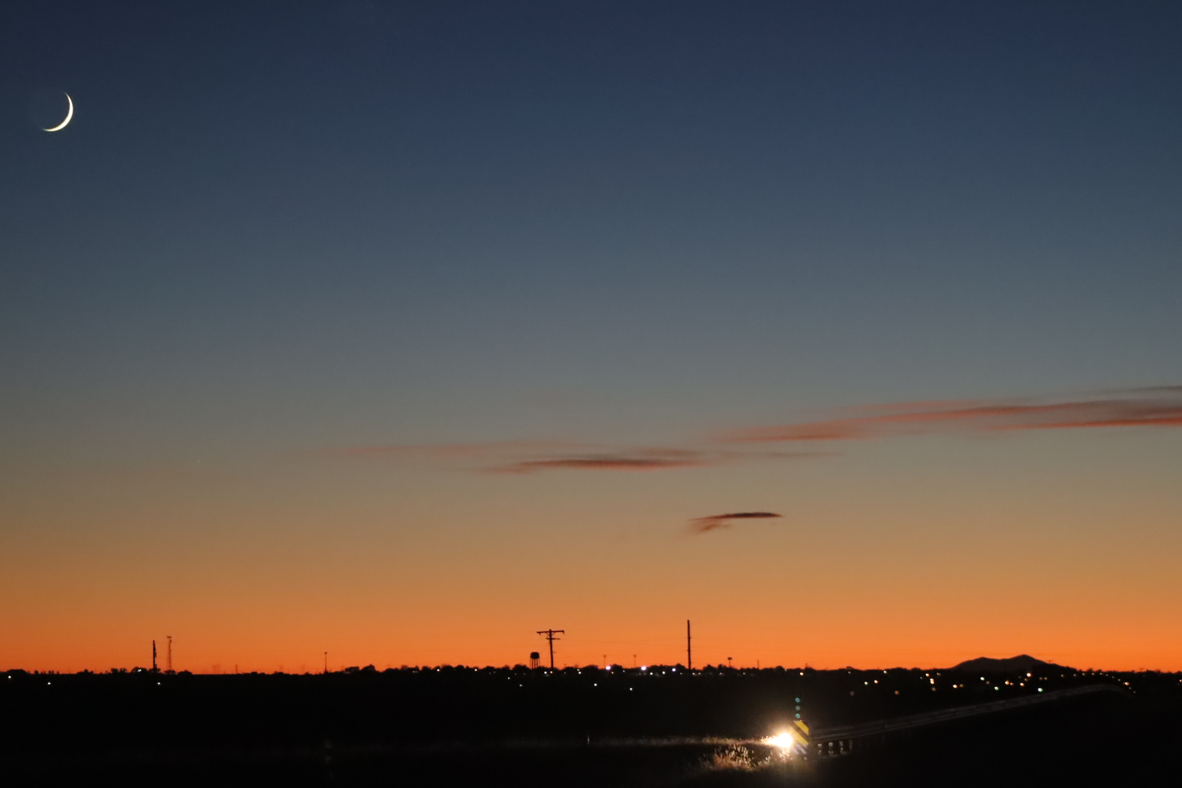 Twilight on Hwy 50 with the glow of La Junta city lights. A car headlight can be seen heading eastbound while a orange and blue sky begins to fade to black. All the while the waxing crescent moon grows each night this month as it reflects the Sun's light for a few brief hours before sinking below the Western horizon.