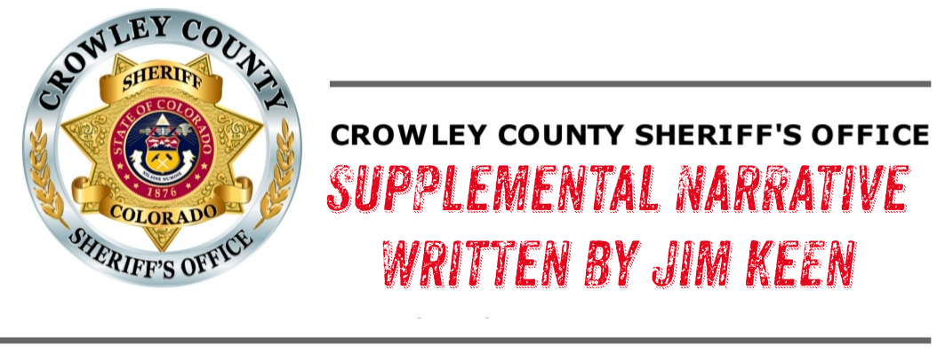 On 2 May 2024, Undersheriff Jim Keen was able to complete a warrant for searching the vehicle involved with this incident. It was towed to the Crowley County Shops and placed in a secured location. CBI was contacted and stated they will be here on 3 May 2024 to complete the search for possible body fluids inside the vehicle.