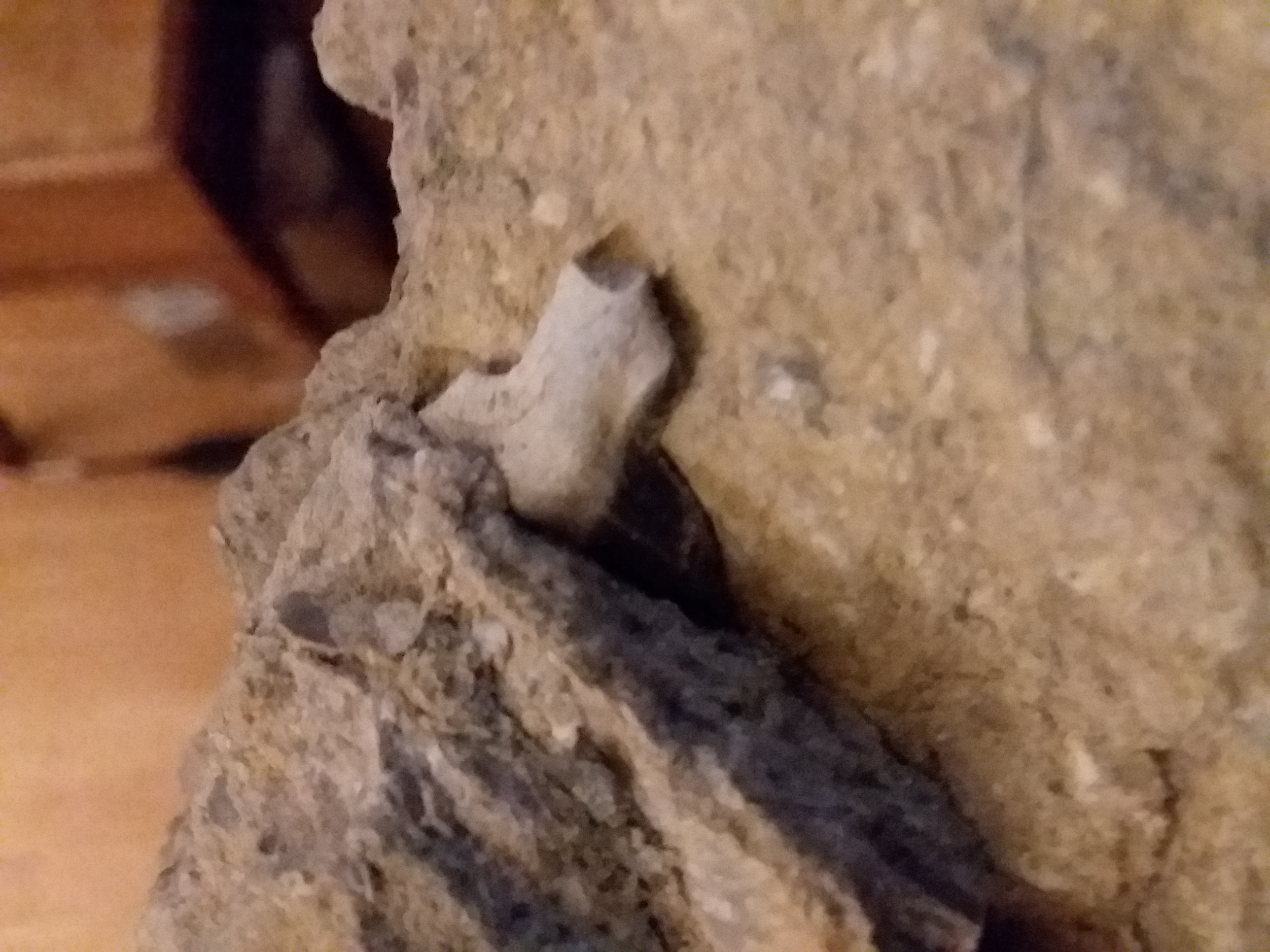 This fossilized bone was exposed to the elements by erosion and people digging through the layers in this well trafficked park. Notice the many bone and shell fragments scattered in the layers of rock.