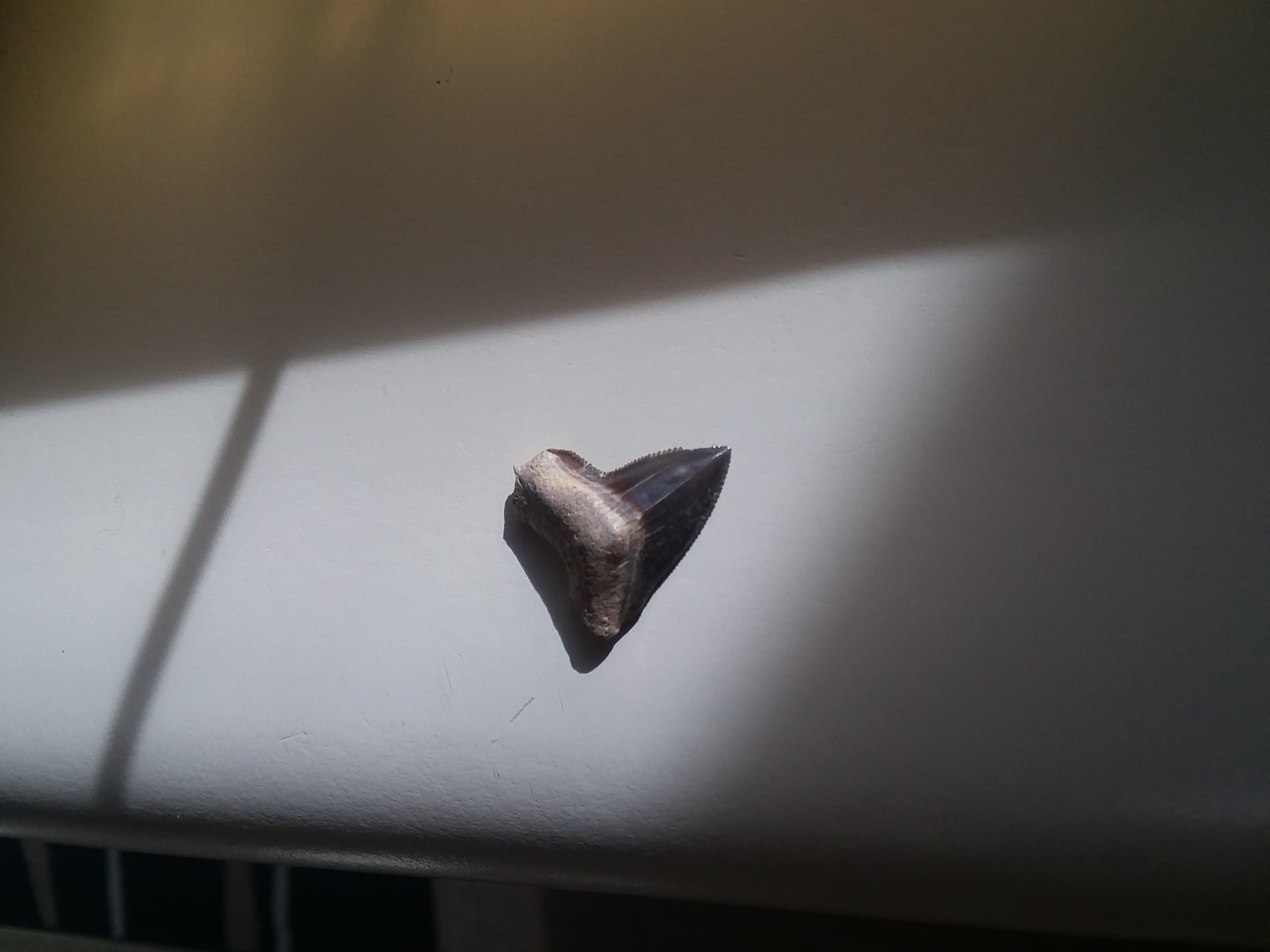 After a little effort under a running faucet this small serrated shark tooth was extracted from several layers of hardened sediment. A water pic would make the process easier and more controlled than prying with finger tips and a knife edge under running water. Again, this is not a how-to article, but rather a shared experience demonstrating the history beneath our feet.