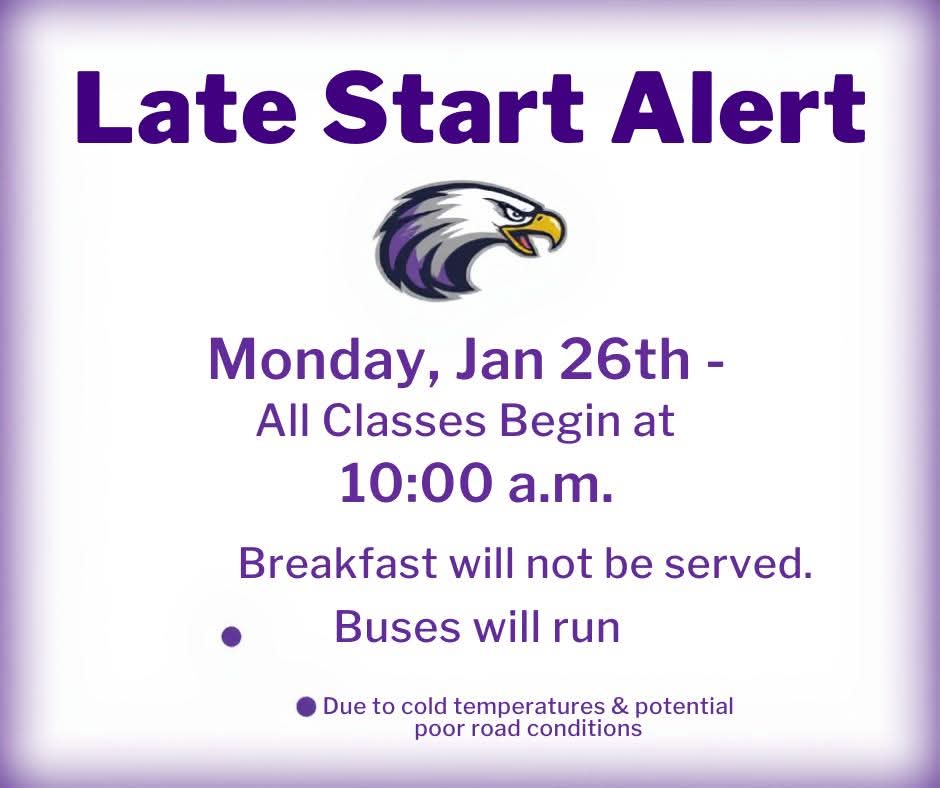 Due to cold temperatures and potential hazardous road conditions, Campo School District will have a late start on Monday, Jan. 26th. All classes will begin at 10:00 a.m. Breakfast will not be served. Buses will run 2 hours late.