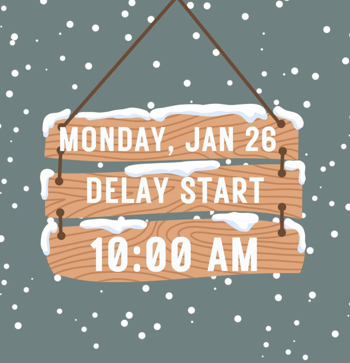 Swink Schools will have a 2-hour delayed start on Monday, January 26, due to inclement weather and to allow for all surfaces to be cleared for safety. No Breakfast will be served.