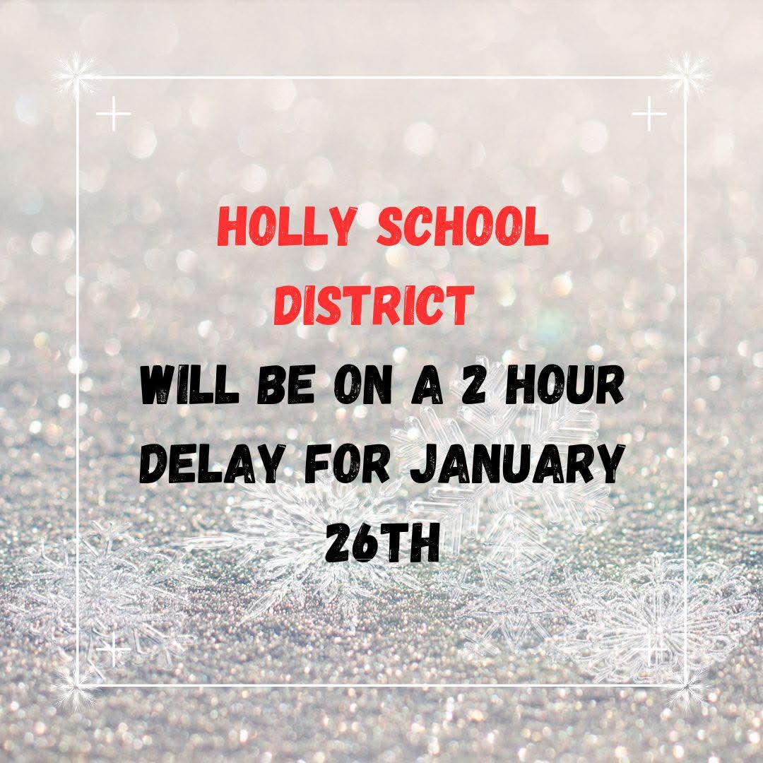 Holly School will have a delayed start on Monday, January 26th. Classes will start at 10:00 am. Buses will run starting around 8:50 am. No AM preschool.