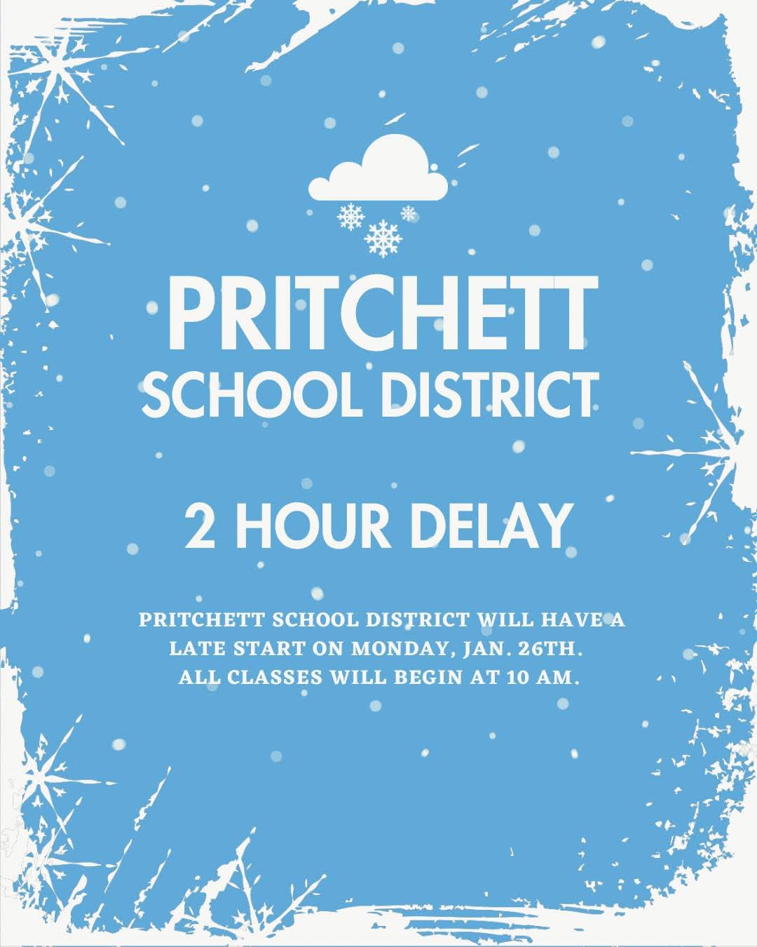 Out of an abundance of caution, Prichett School District will have a delayed start tomorrow due to expected temperatures and road conditions. Classes will begin at 10:00 AM.