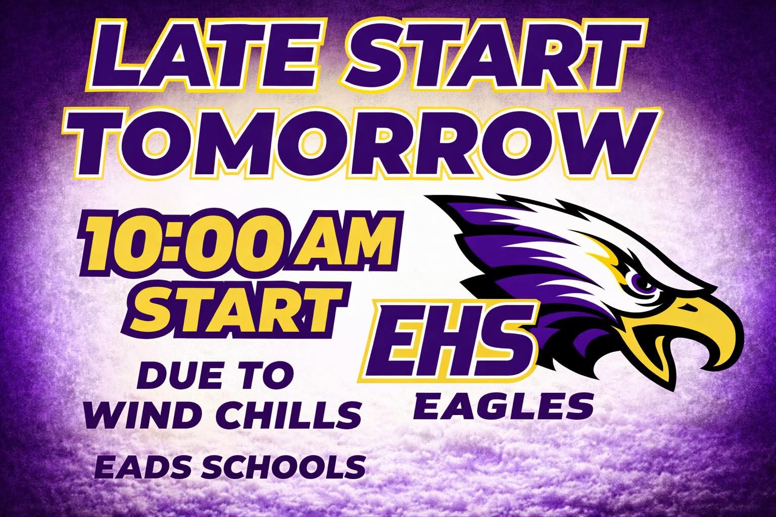 Eads School will be on a 2-Hour Delay tomorrow (Monday, January 26th, 2026) due to predicted windchills. School will start at 10:00 AM. No AM Preschool.