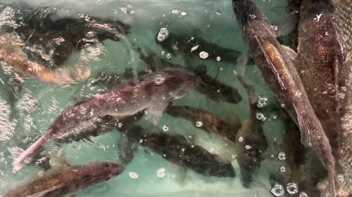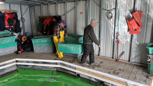 During spawning, biologists gently collect eggs (roe) from female fish, milt from male fish, and combine them in a controlled fertilization process. The eggs and milt are stirred with goose feathers, a technique that allows them to be stirred gently without damage.