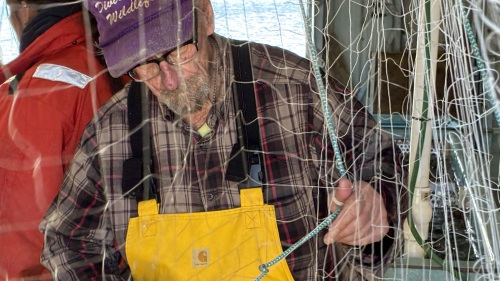 (Vertical) Volunteers Russ Dewey and Dan Frankowski repair nets daily during walleye spawning operations at Lake Pueblo boathouse.