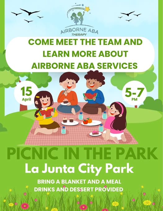 Description: Families are invited to a free Picnic in the Park on April 15 at La Junta City Park. Enjoy food, meet Airborne ABA Therapy, and learn about services for children.