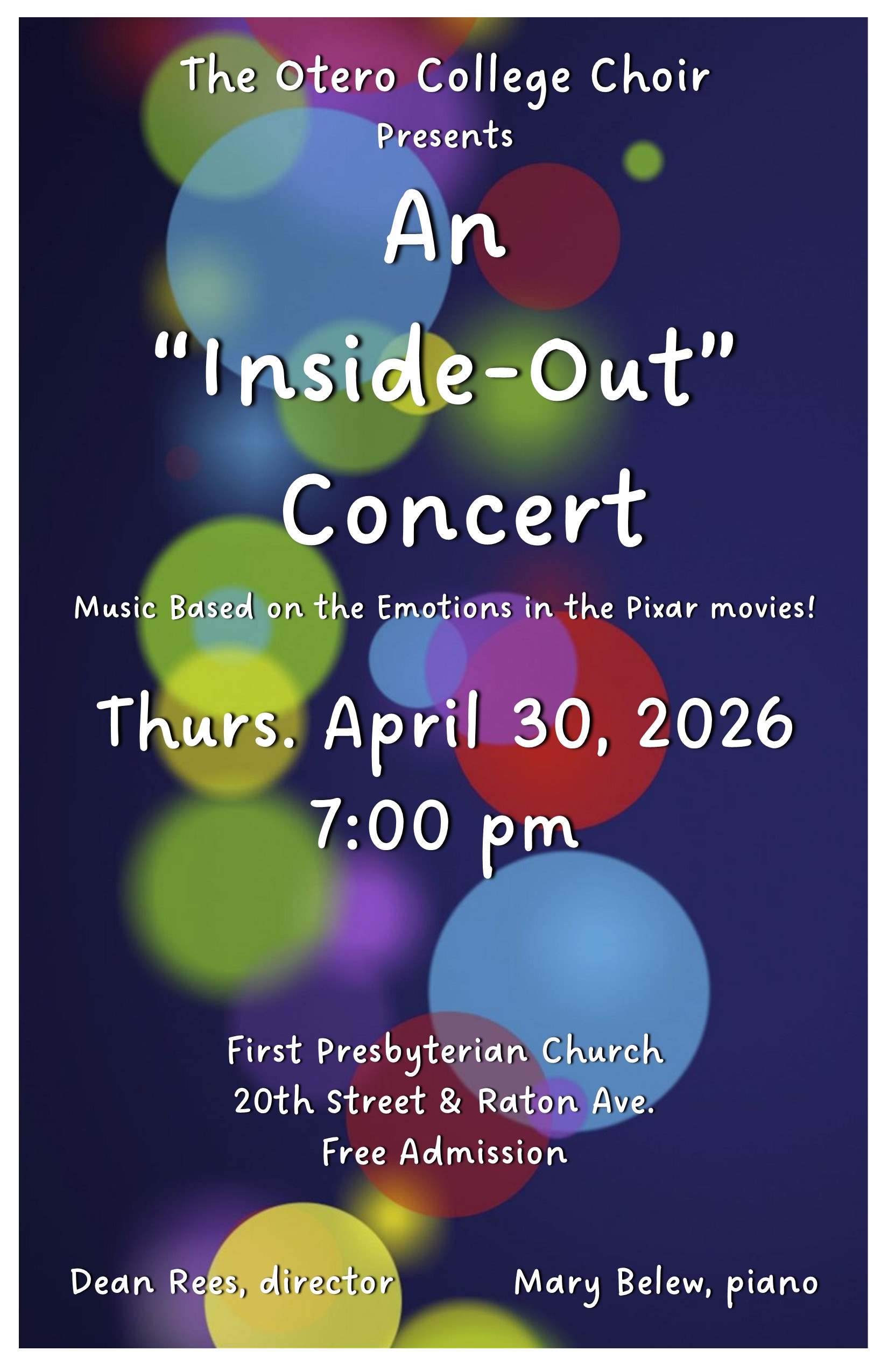 Description: The Otero College Choir presents a free “Inside Out” themed concert on April 30, 2026, at First Presbyterian Church in La Junta, featuring songs inspired by emotions from Pixar films and Broadway hits...